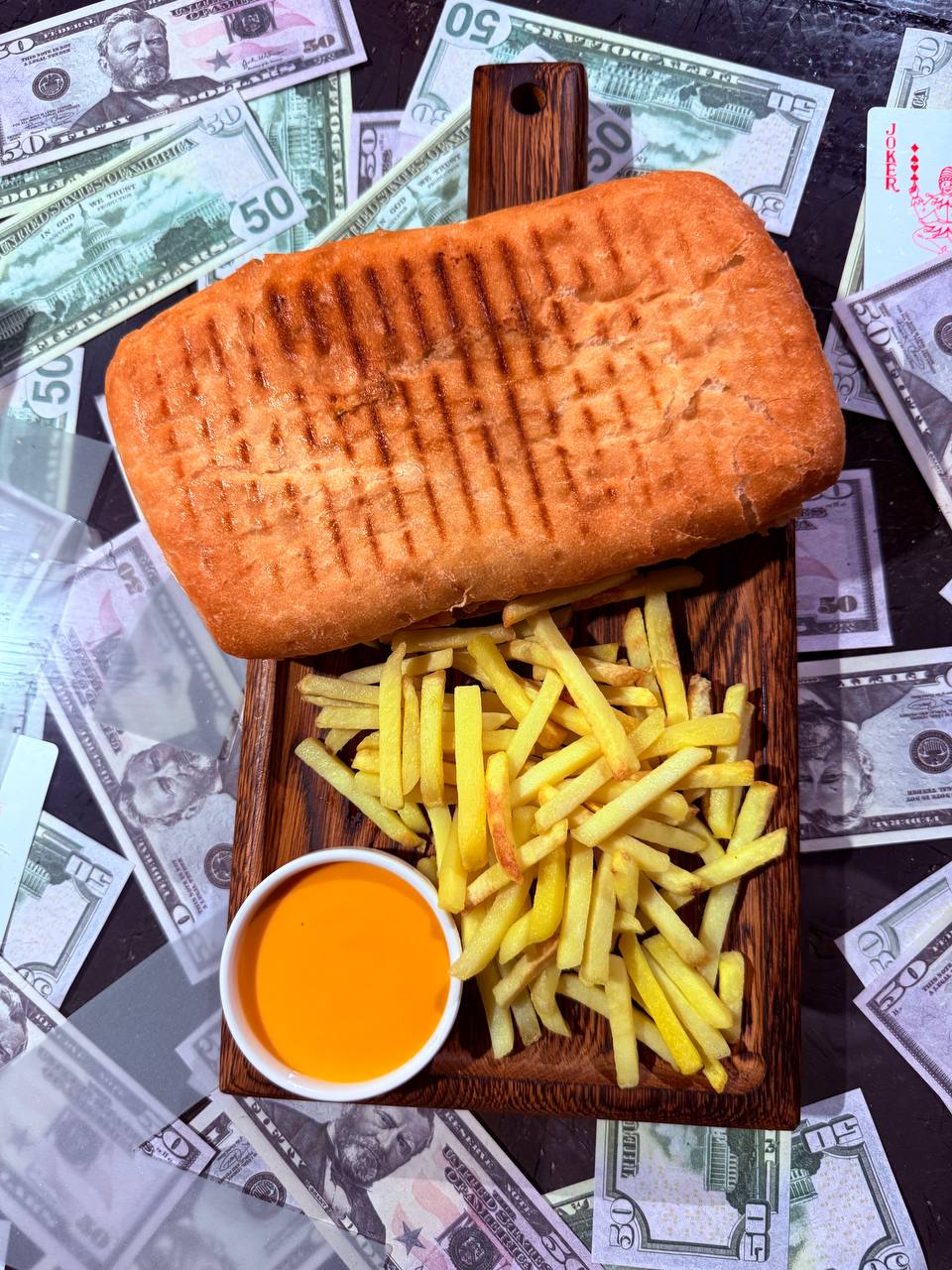 Чиабата с куриной грудкой, плавленым сыром, салат айсберг, маринованные огурцы, свежие помидоры, соус сырный, соус чесночный, соус горчичный, скрэмбл, подается с картофелем фри и сырным соусом