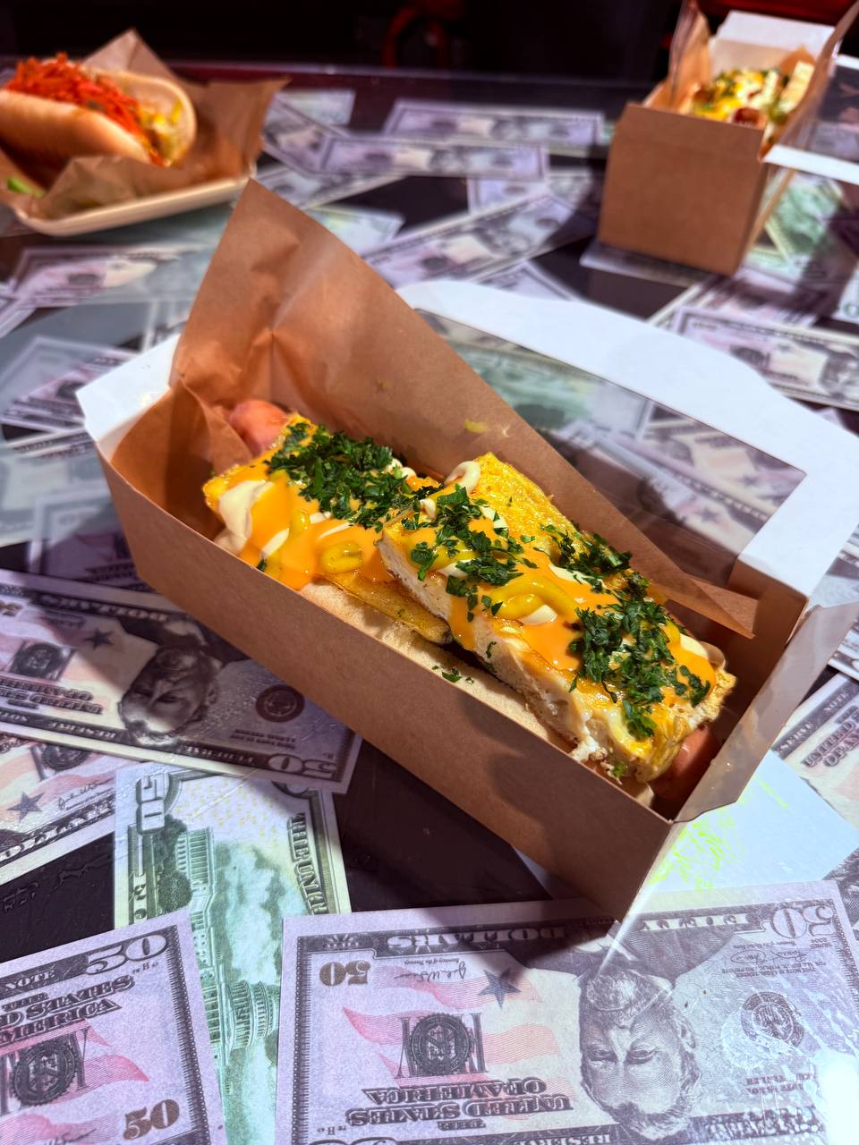 Французская булочка, говяжья сосиска, морковка по-корейски, капуста квашеная, соус чесночный, сырный, кетчуп, горчица