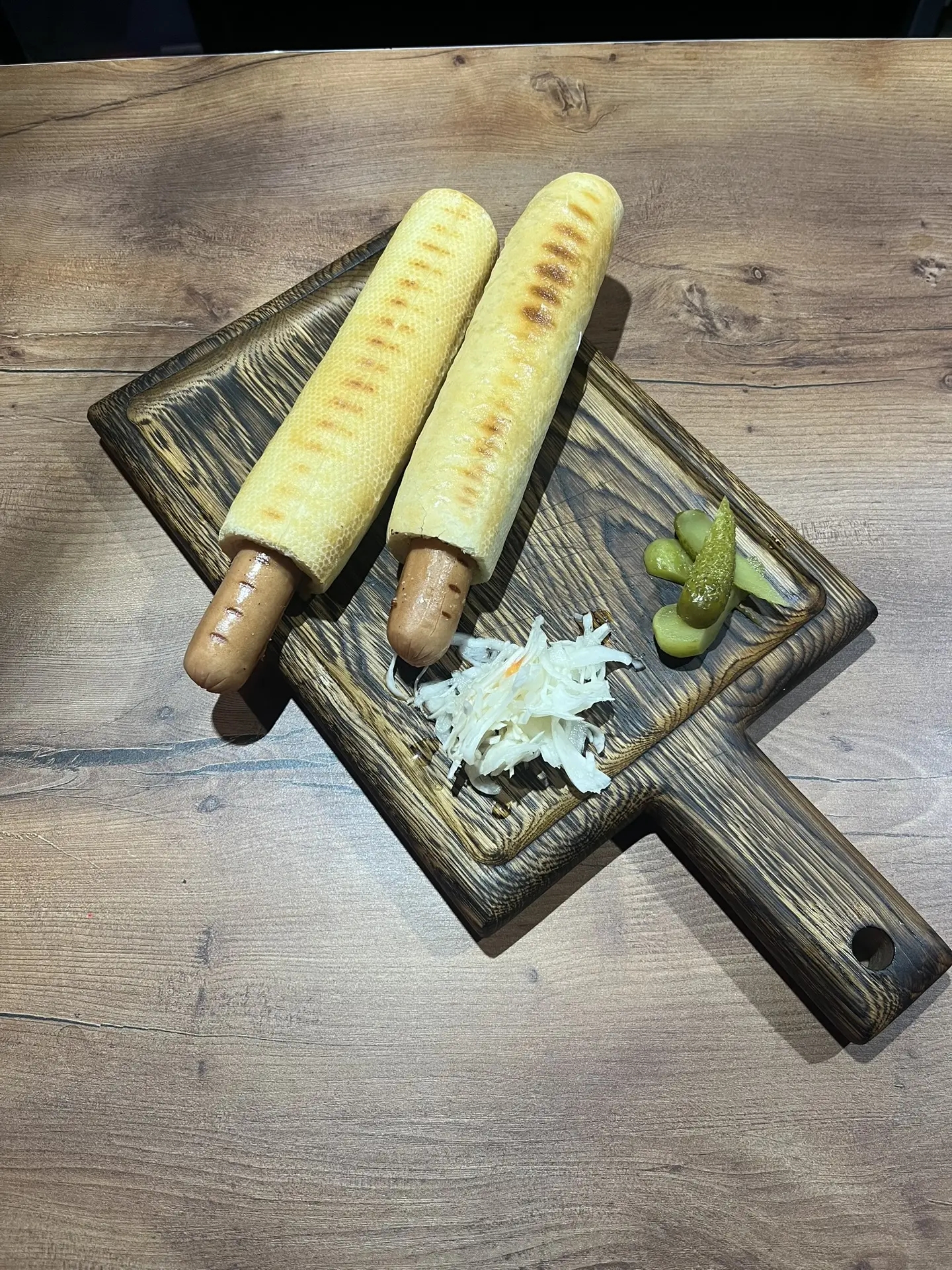 Состав: Свежая булочка, сочная говяжья сосиска, жареные с розмарином грибы-шампиньоны, маринованный лук, салат айсберг, маринованный огурец, соус чесночный, сырный, кетчуп, горчица, подается с битыми огурцами