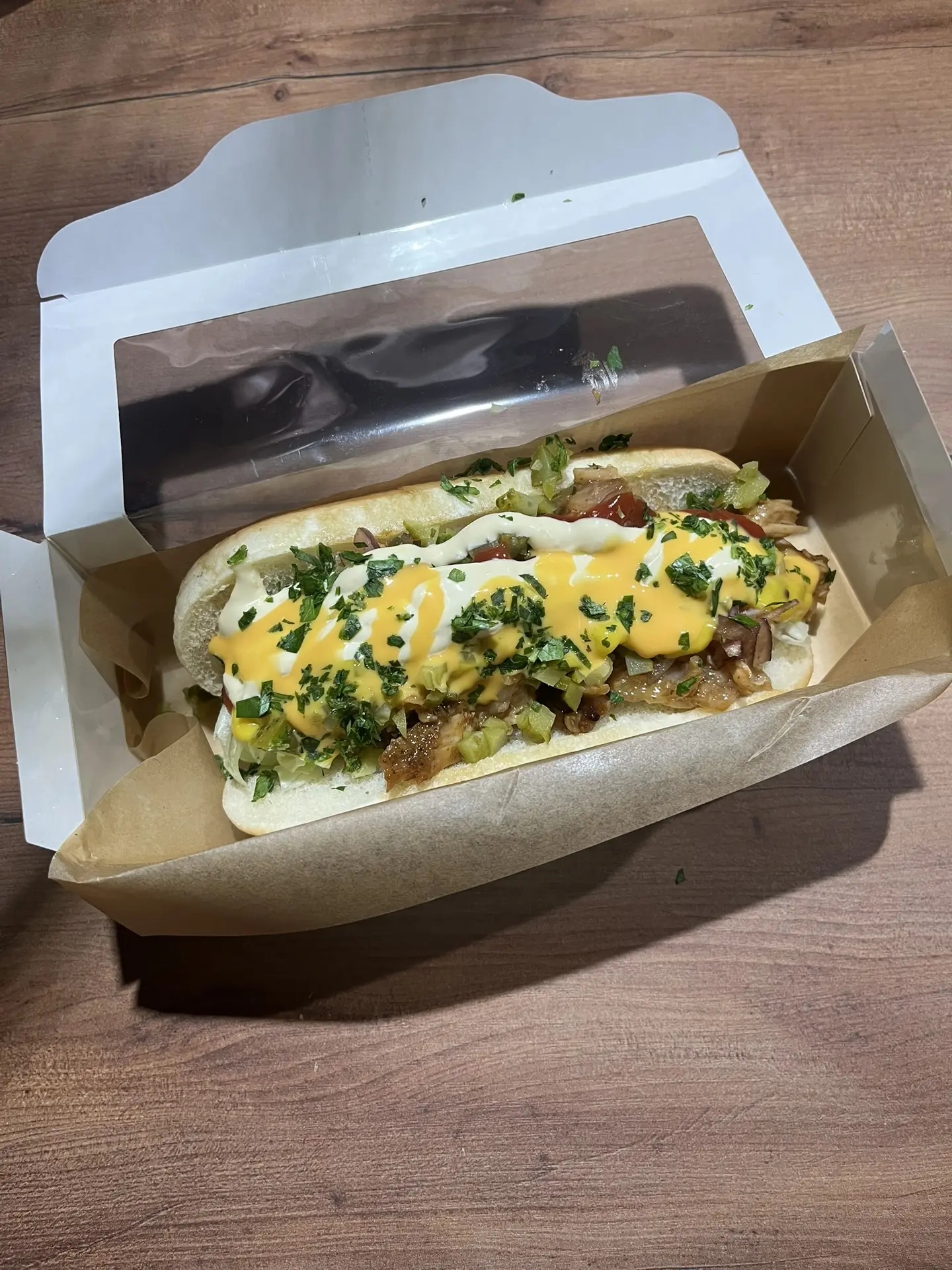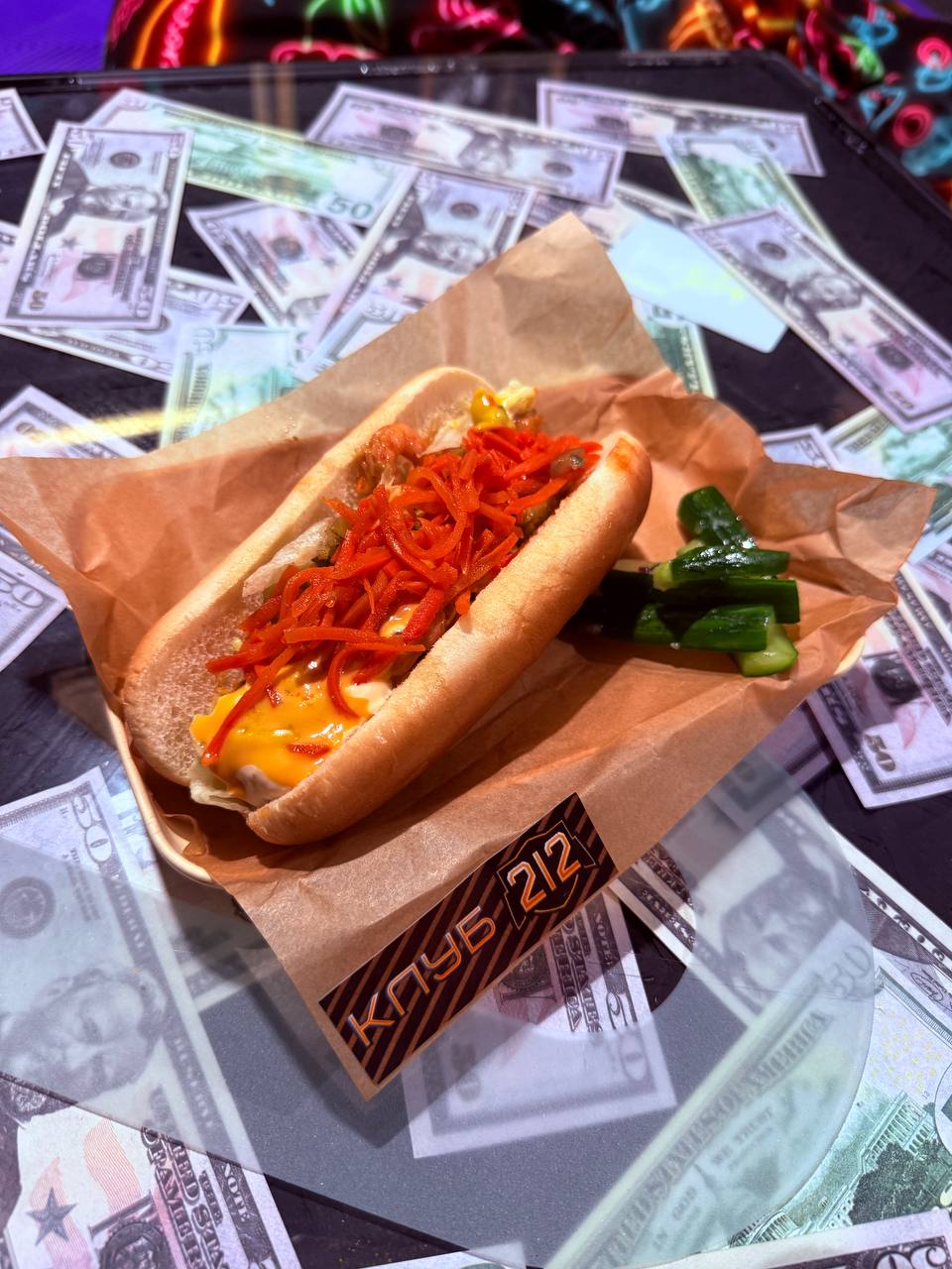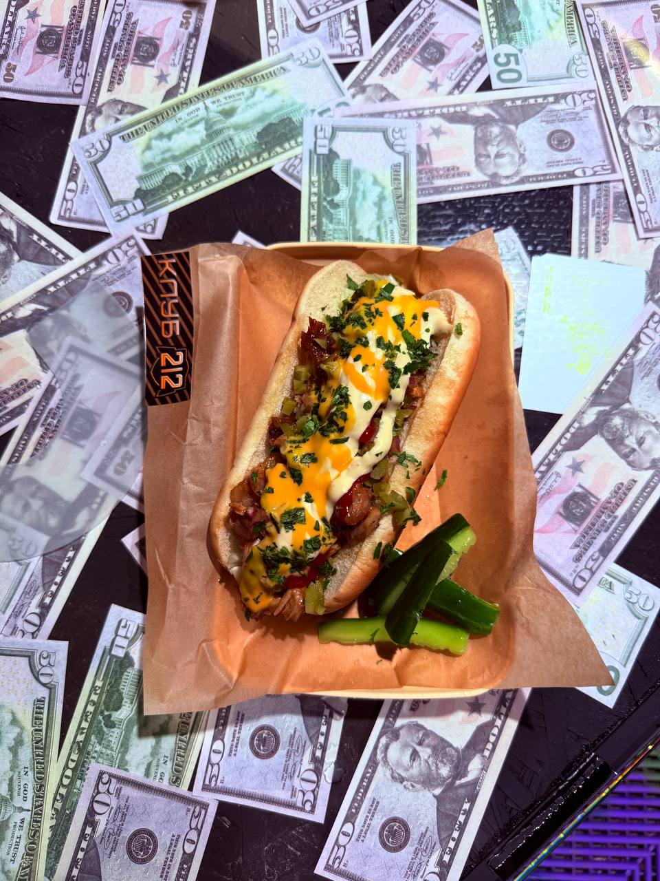 Состав: Свежая булочка, сочная говяжья сосиска, маринованный лук, салат айсберг, маринованный огурец, соус чесночный, сырный, кетчуп, горчица, подается с битыми огурцами